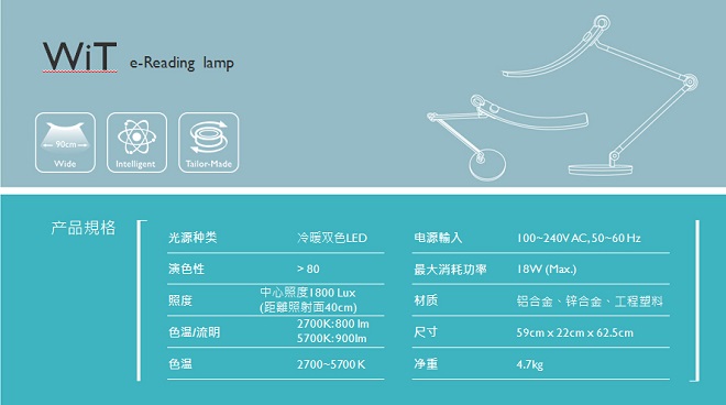 WiT擁有一個彎曲的燈頭,這也是其照明廣度達到90公分的原因。WIT的燈頭盒燈臂均采用特殊鋁合金,質地輕盈且堅韌,具有良好的散熱能力。