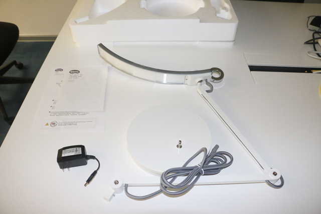 包裝盒內含有護眼燈主體、護眼燈底座、電源插座、產品說明書和便捷指南,其中護眼燈主體、底座用塑料薄膜覆蓋,防止刮花。