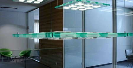 每個燈具由一塊鑲嵌有“OLED三明治”(9個亞克力板)的玻璃面板、兩個120 x 120mm的正方形Orbeos SDW-058 OLED面板組成。這些燈具被安裝在天花板上,高度可單獨調節,據說可創造“令人印象深刻的3D效果”。OLED面板也可單獨控制、亮度自由變換,給人一種動態視覺、柔和的燈光效果。