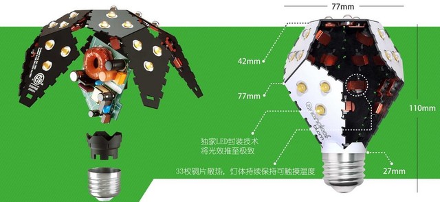 從外型上來看,這款綠諾LED燈泡的設計獨特,顛覆了傳統燈泡的外觀設計,有著較強的視覺沖擊力。該產品由11面印刷電路板拼合而成,總共有33枚LED燈珠,可以為家庭及商業用戶提供360度的照明體驗。