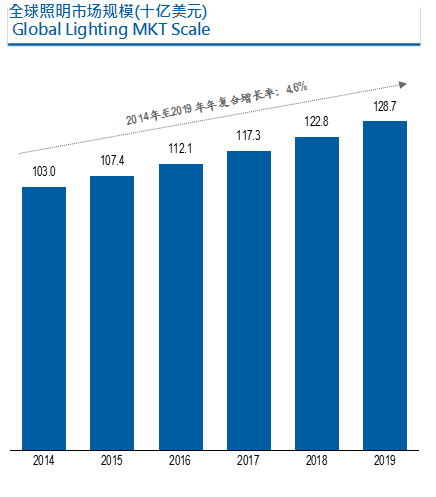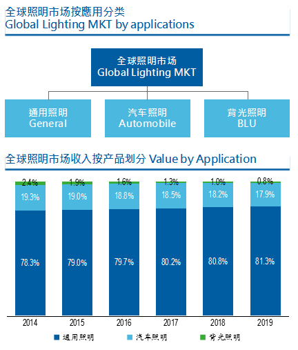 林紀良先生援引資料表示,全球照明市場整體規模到2019年預計將達到1287億美元,2014年至2019年年復合增長率預計達到4.6%。按產品劃分,全球照明市場可分為通用照明、汽車照明和背光照明。其中,通用照明為主要產品,占整體全球照明市場總額的80%左右。