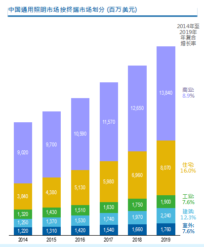 按終端市場劃分,中國通用照明市場可分為商業(包括酒店、辦公及商店)、住宅、工業、建筑及室外五大市場,其中商業領域是最大的市場板塊,占2014年整體市場規模的54.2%。而受益于城市化進程以及繁榮的房地產行業發展,住宅領域預計為2014年至2019年增長最快的領域,復合增長率達到16.0%