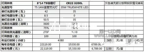 此時,只要對應3*14W的替換型LED燈具的燈具效能高于49.9lm/W,我們就可以說它相對于原來的格柵燈來說是節能的。舉例如下: